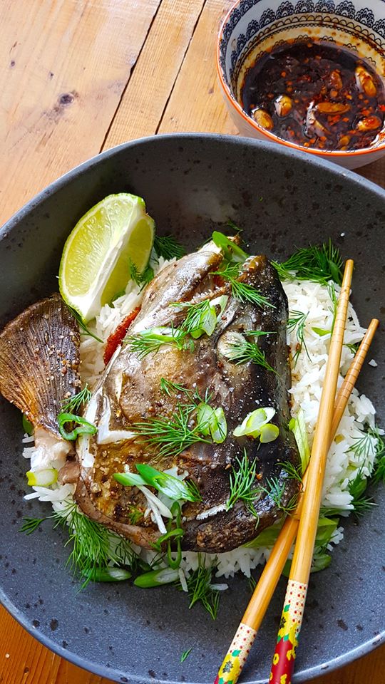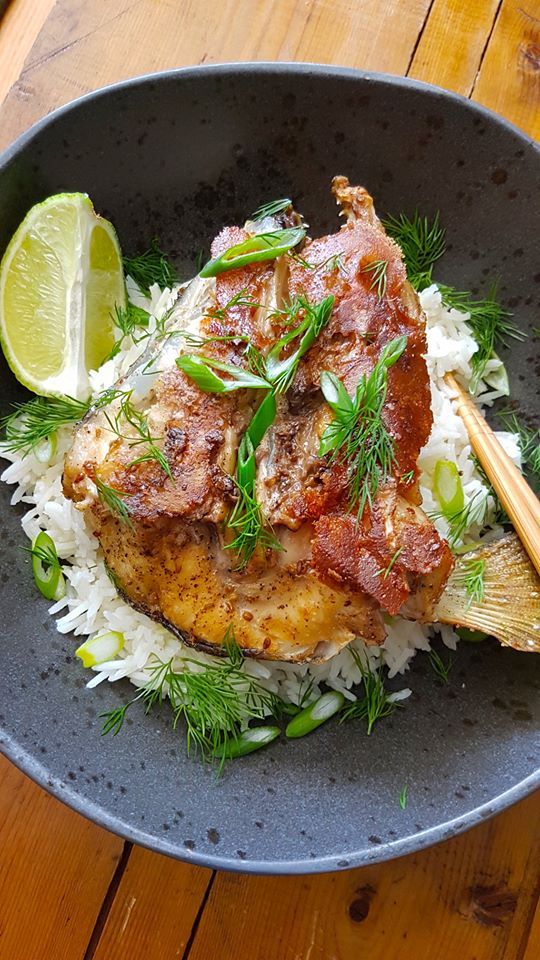 - Dry fish head, then carefully yet forcefully split head in half. Drizzle oil over fish, making sure there’s a good coating on both sides. Then season both sides with Salt, Pepper, a dusting of Ginger Powder and a sprinkle of Anise Seeds.
