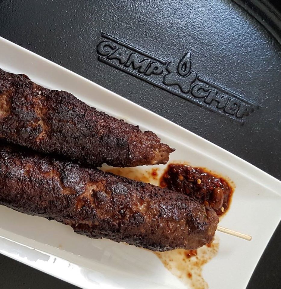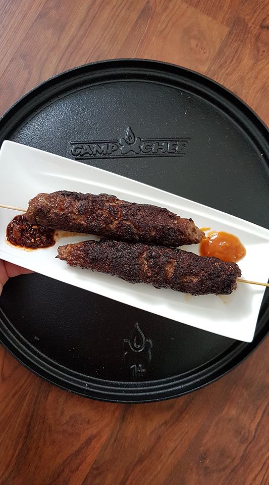 - Cook kabobs in a large cast iron, or heavy bottom pan, over medium heat with a good amount of oil, make sure pan is heated up before placing kabobs in. Rotate every couple of minutes, careful not to burn, gently turn them so they don’t come apart. Once all sides are nice and brown they should be ready to serve. We like dipping them in some hot sauces but feel free to dip in bbq sauce or whatever you like.